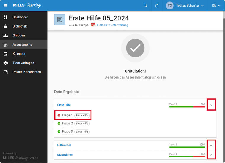 Über die Pfeilschaltfläche können Sie einsehen, welche Fragen der Teilnehmer richtig und falsch beantwortet hat.
