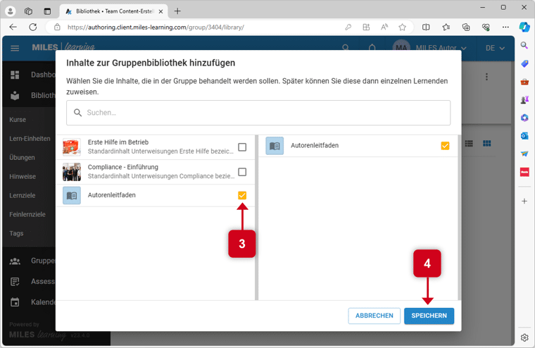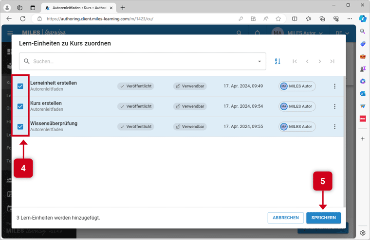 Durch Aktivierung des Auswahlkästchens können Sie festlegen, welche Lerneinheit dem Kurs hinzugefügt werden soll.