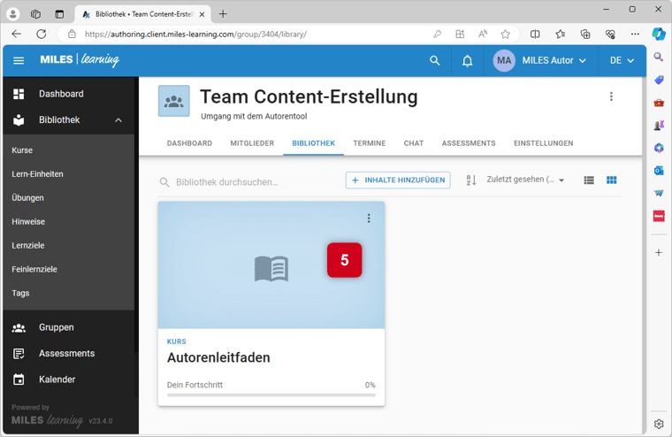 Haben Sie die Zuweisung (eigenes Hinweisfenster) bestätigt, erscheint der Kurs in der Gruppenbibliothek.