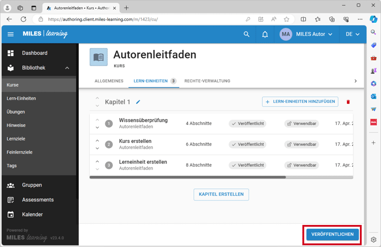Beachten Sie, dass Sie auch einen neuen Kurs veröffentlichen müssen. Natürlich auch dann, wenn Sie Änderungen am Kurs durchgeführt haben.