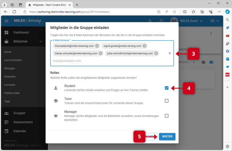 Natürlich müssen Sie eine Einladung nicht jedem Lernenden einzeln schicken. Das Feld E-Mail-Adresse hat Platz für 30 Empfänger.
