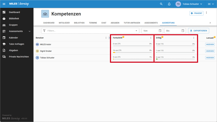 Entsprechend Ihrer Filtereinstellungen erhalten Sie dann den Fortschritt, den Erfolg und die Lernzeit ausgegeben.