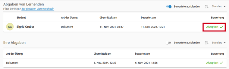 In der Spalte Bewertung sehen Sie, dass die Abgabe akzeptiert wurde.