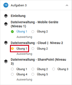 Sobald eine Abgabe erfolgt ist, wird beim Lernenden die entsprechende Übung mit einem gelb hinterlegten Fragezeichen hervorgehoben.